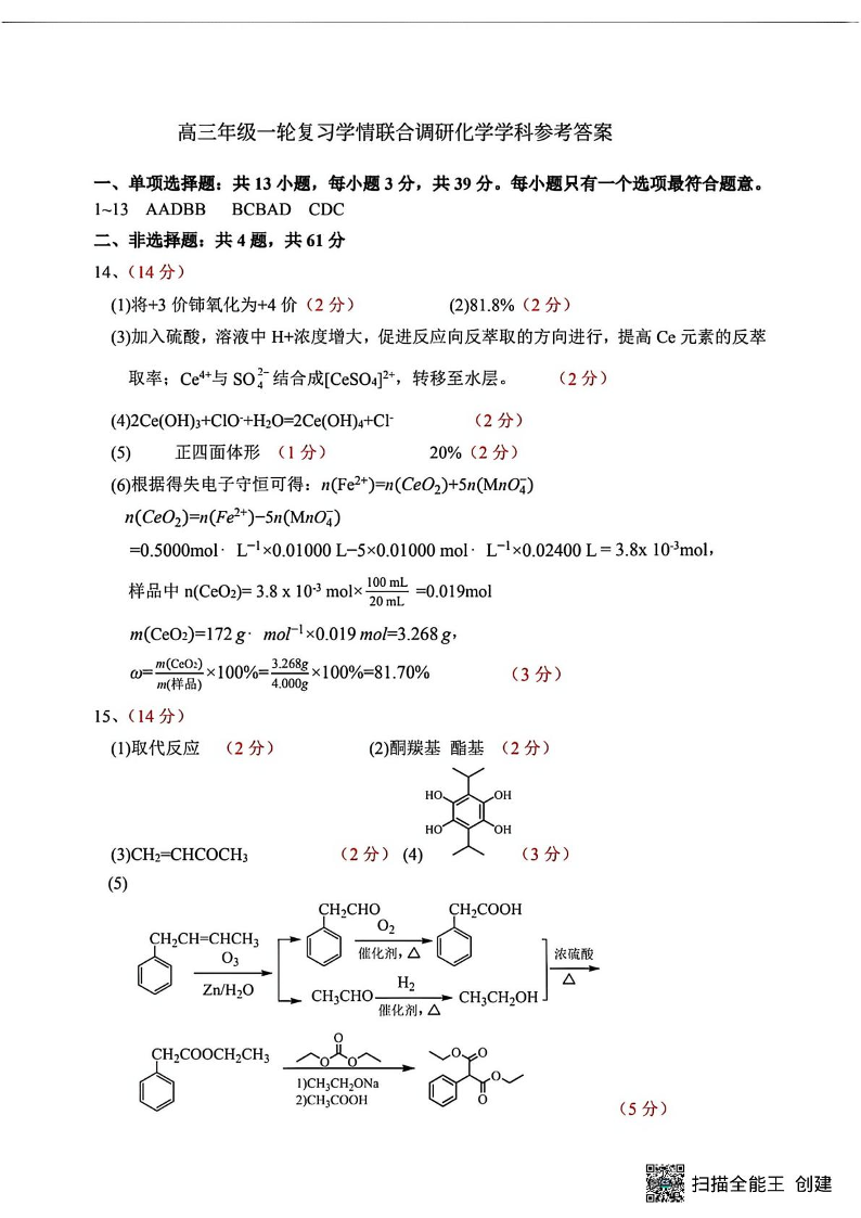 高三化学答案--苏州九校2026届高三上学期一轮复习学情联合调研