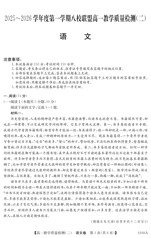 高一语文--广东省纵千文化2025~2026学年度第一学期八校联盟高一教学质量检测(二)