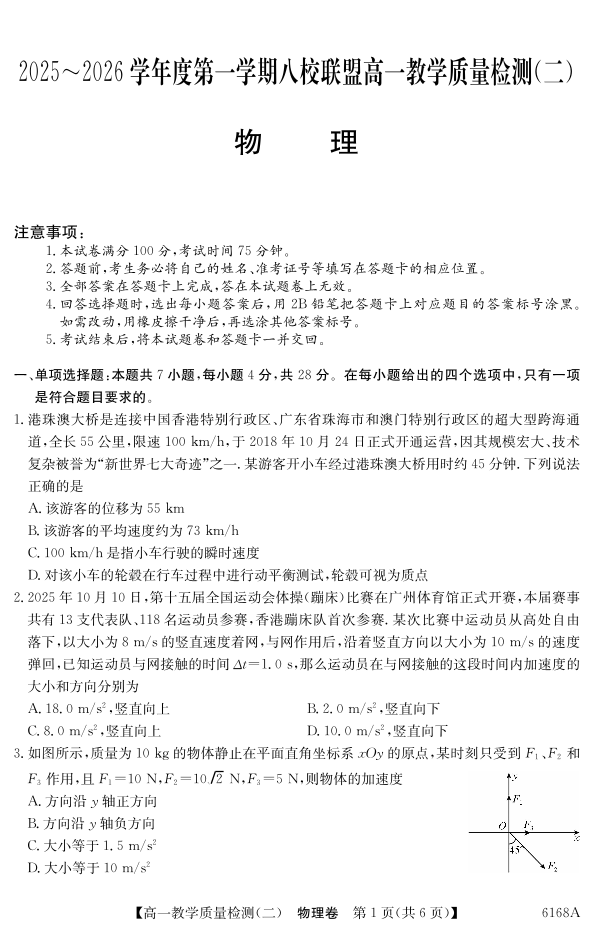 高一物理--广东省纵千文化2025~2026学年度第一学期八校联盟高一教学质量检测(二)