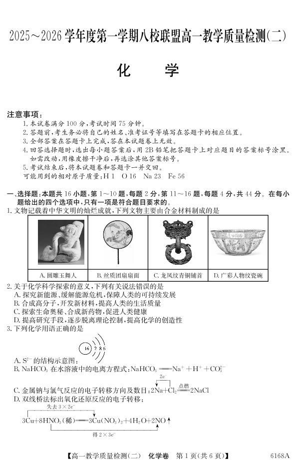 高一化学--广东省纵千文化2025~2026学年度第一学期八校联盟高一教学质量检测(二)