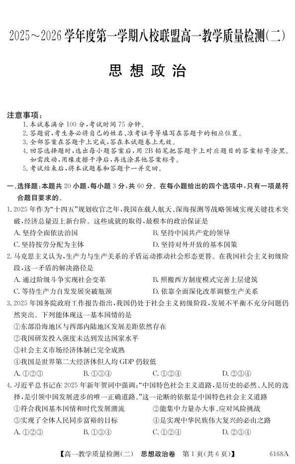 高一政治--广东省纵千文化2025~2026学年度第一学期八校联盟高一教学质量检测(二)
