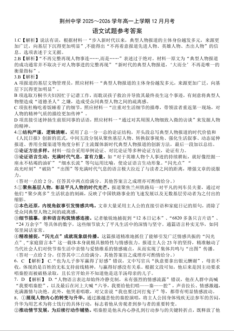 高一语文答案--湖北省荆州市荆州中学2025-2026学年高一上学期12月月考