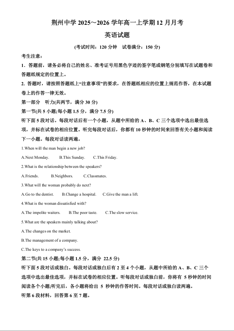 高一英语(原卷版)--湖北省荆州市荆州中学2025-2026学年高一上学期12月月考