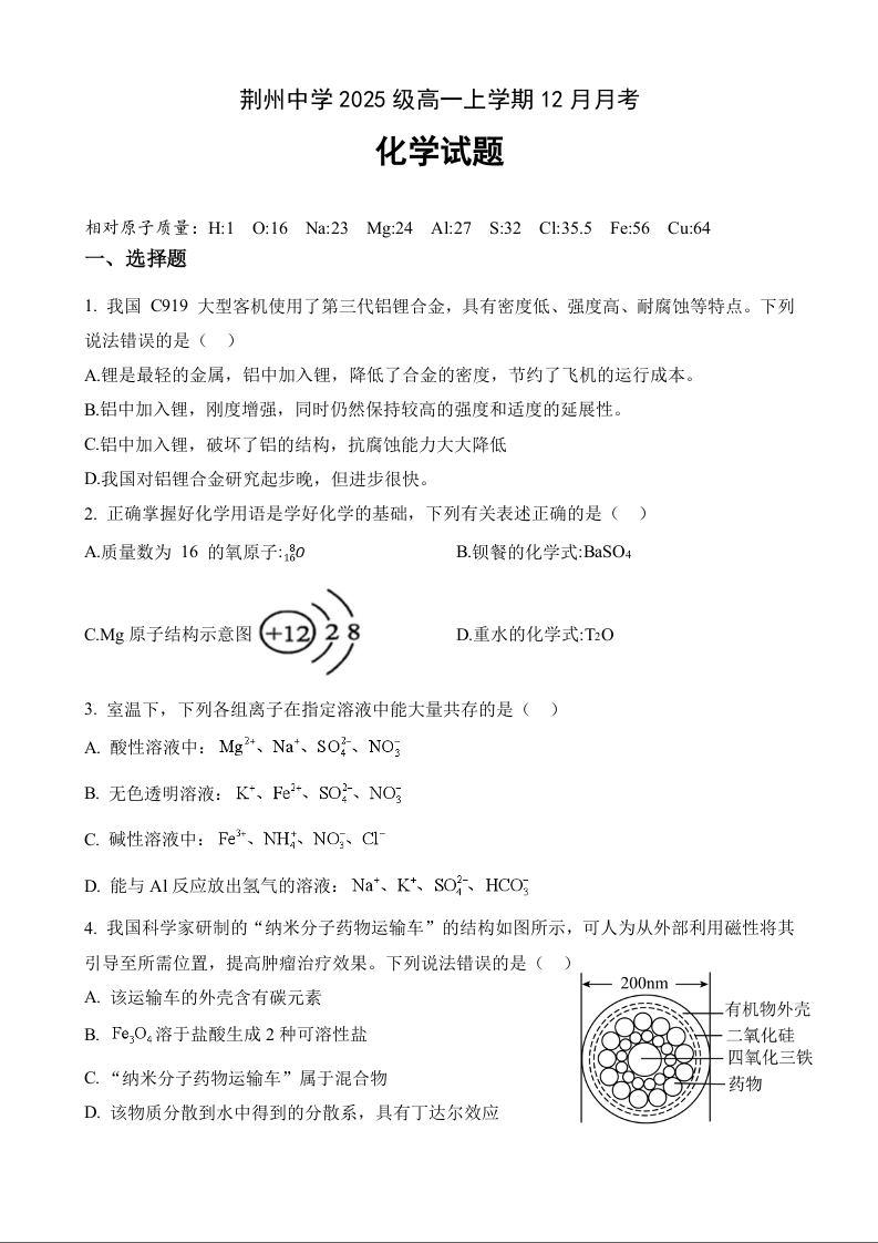 高一化学--湖北省荆州市荆州中学2025-2026学年高一上学期12月月考
