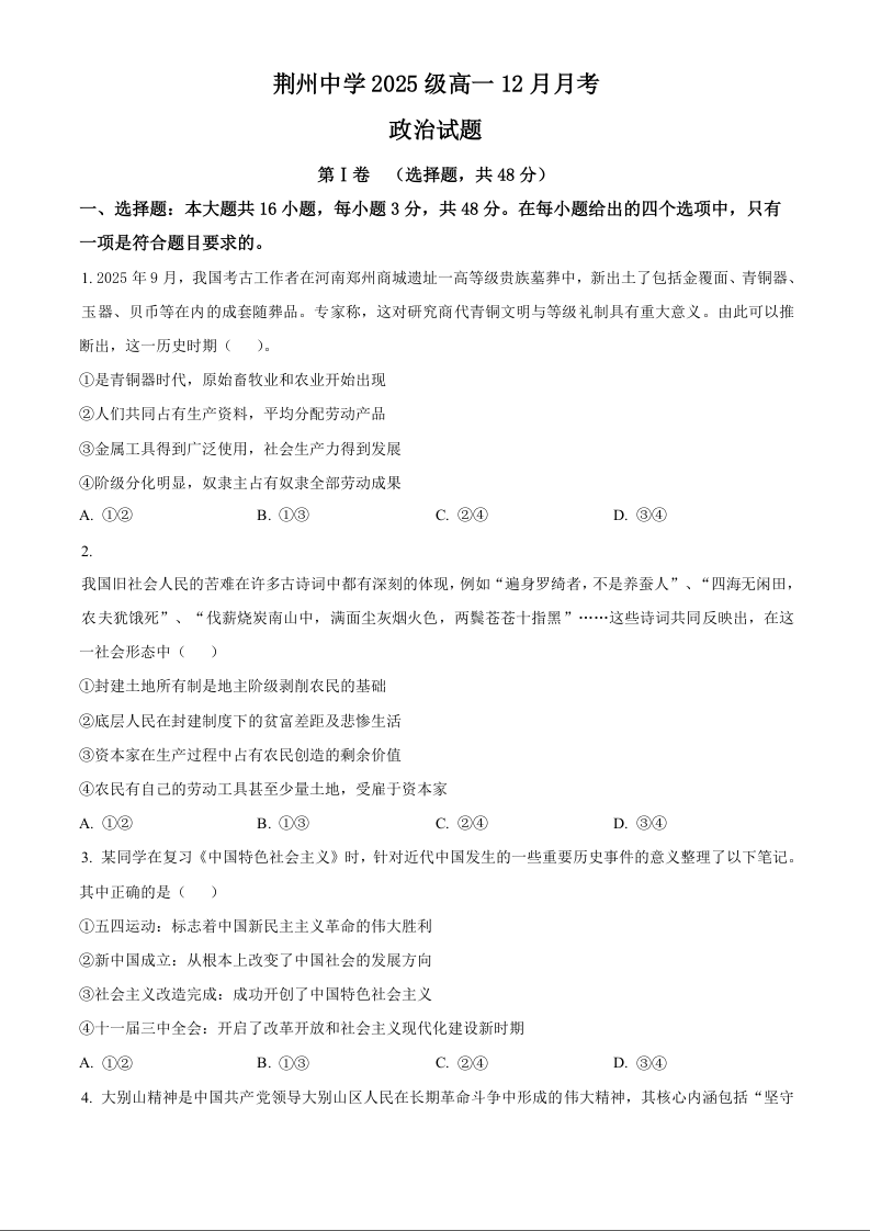高一政治(原卷版)--湖北省荆州市荆州中学2025-2026学年高一上学期12月月考
