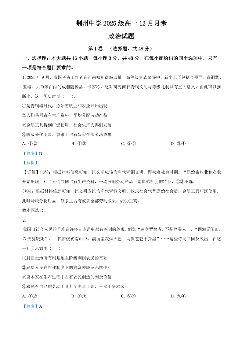 高一政治(解析版)--湖北省荆州市荆州中学2025-2026学年高一上学期12月月考
