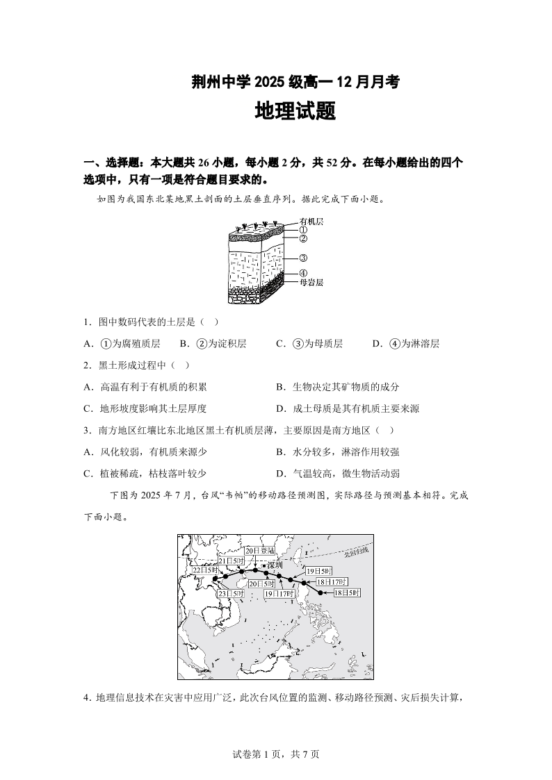 高一地理--湖北省荆州市荆州中学2025-2026学年高一上学期12月月考