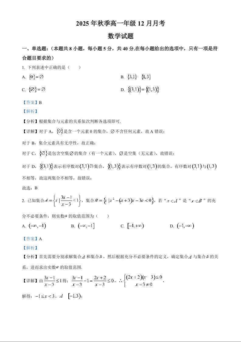 高一数学(解析版)--湖北省重点高中智学联盟2025-2026学年高一上学期12月月考