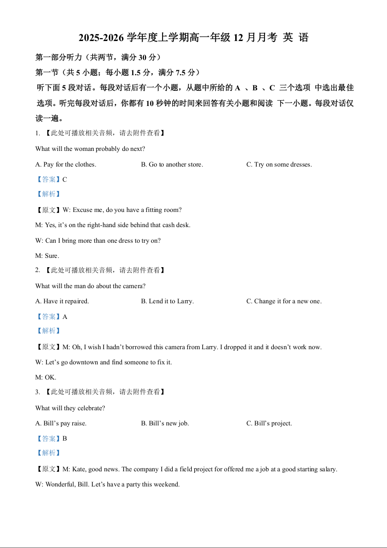 高一英语(解析版)--湖北省重点高中智学联盟2025-2026学年高一上学期12月月考