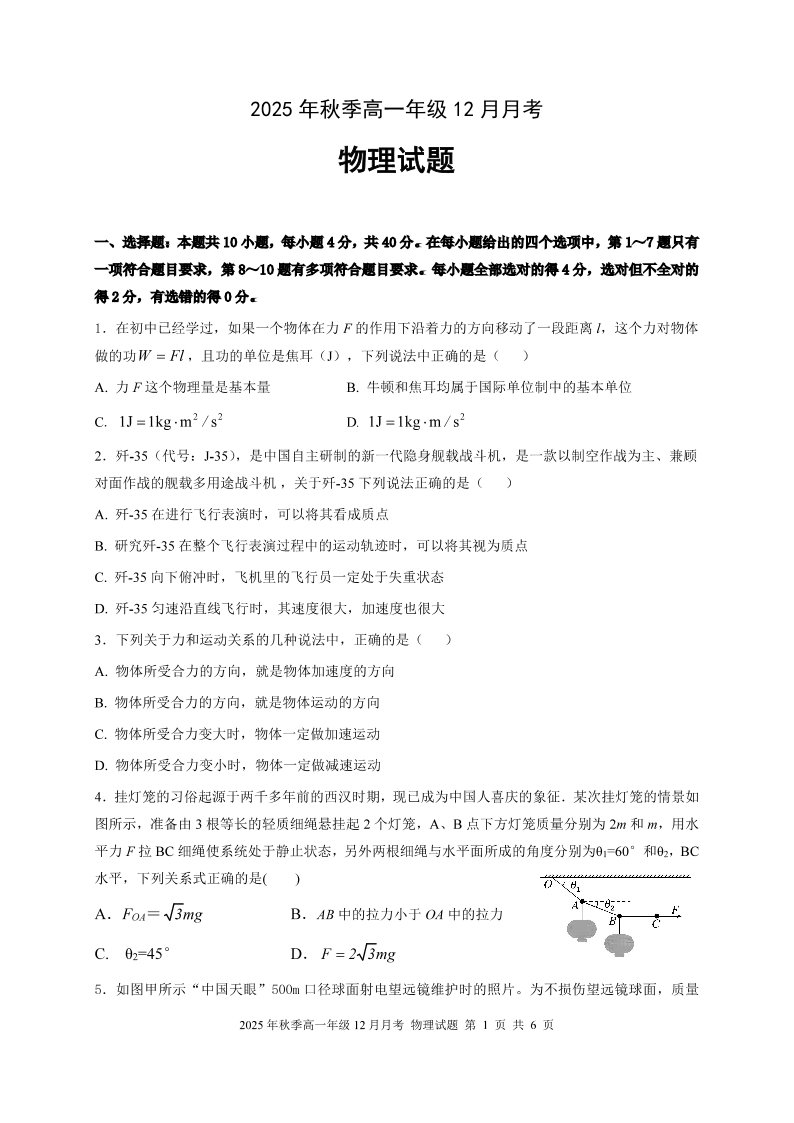 高一物理+答案--湖北省重点高中智学联盟2025-2026学年高一上学期12月月考