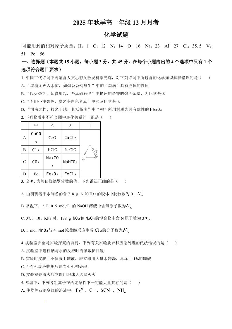 高一化学+答案--湖北省重点高中智学联盟2025-2026学年高一上学期12月月考