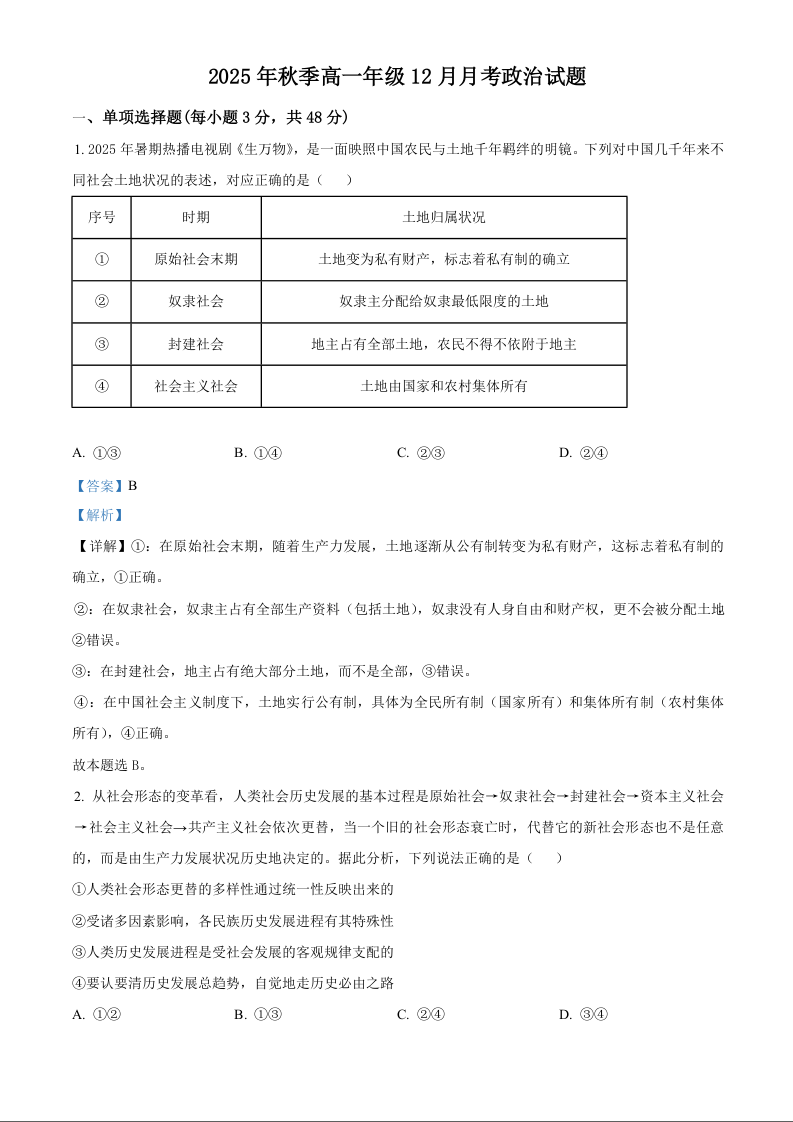 高一政治(解析版)--湖北省重点高中智学联盟2025-2026学年高一上学期12月月考