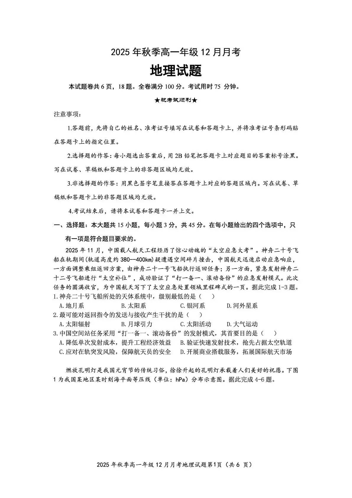 高一地理+答案--湖北省重点高中智学联盟2025-2026学年高一上学期12月月考