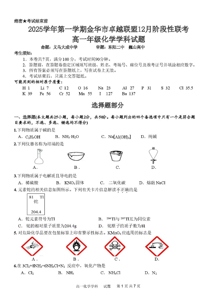 高一化学--浙江省金华市卓越联盟2025-2026学年高一上学期12月月考