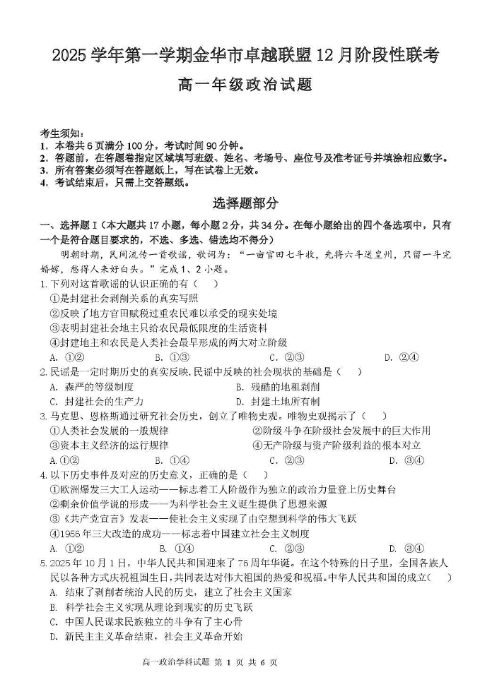 高一政治--浙江省金华市卓越联盟2025-2026学年高一上学期12月月考