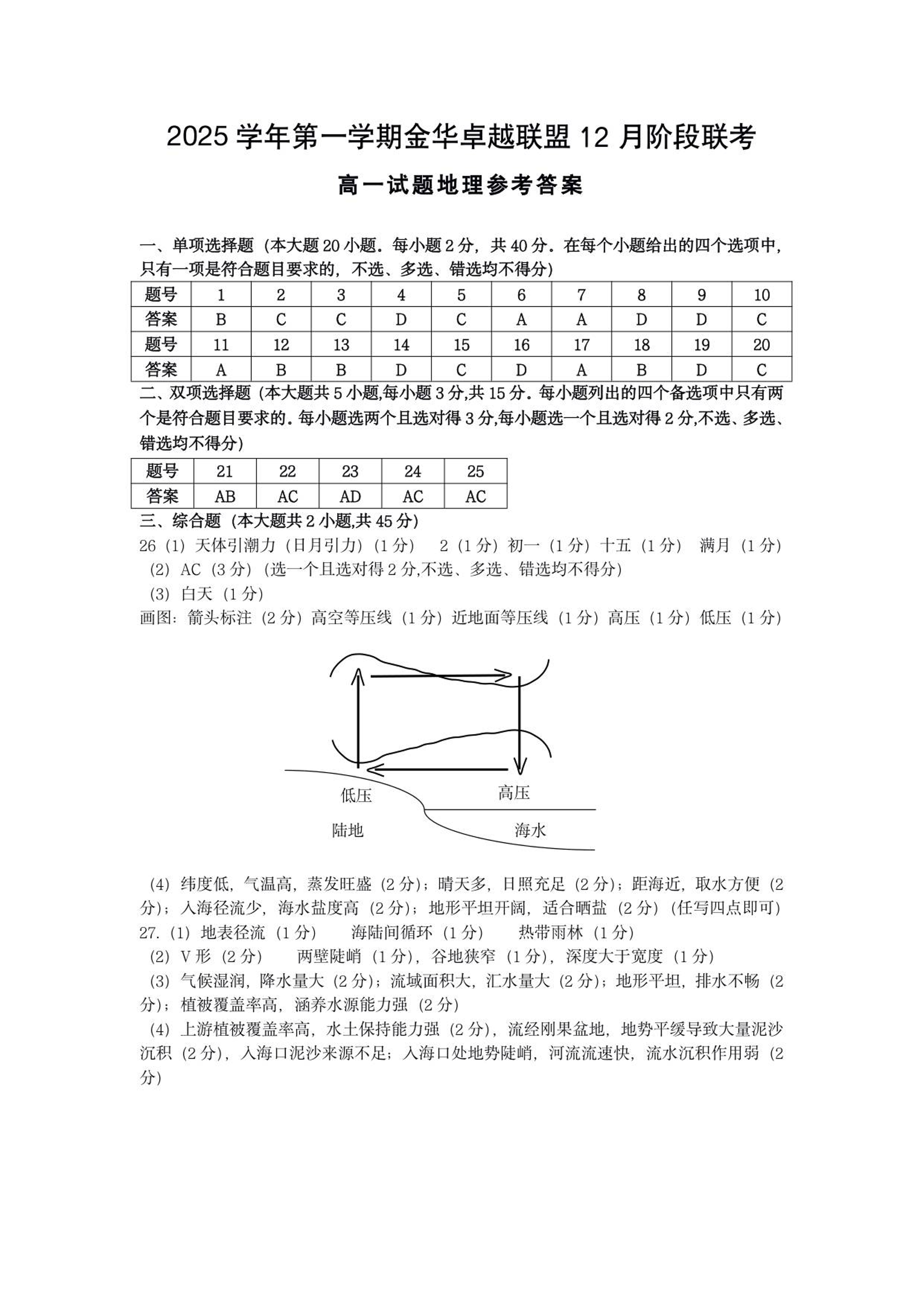 高一地理答案--浙江省金华市卓越联盟2025-2026学年高一上学期12月月考