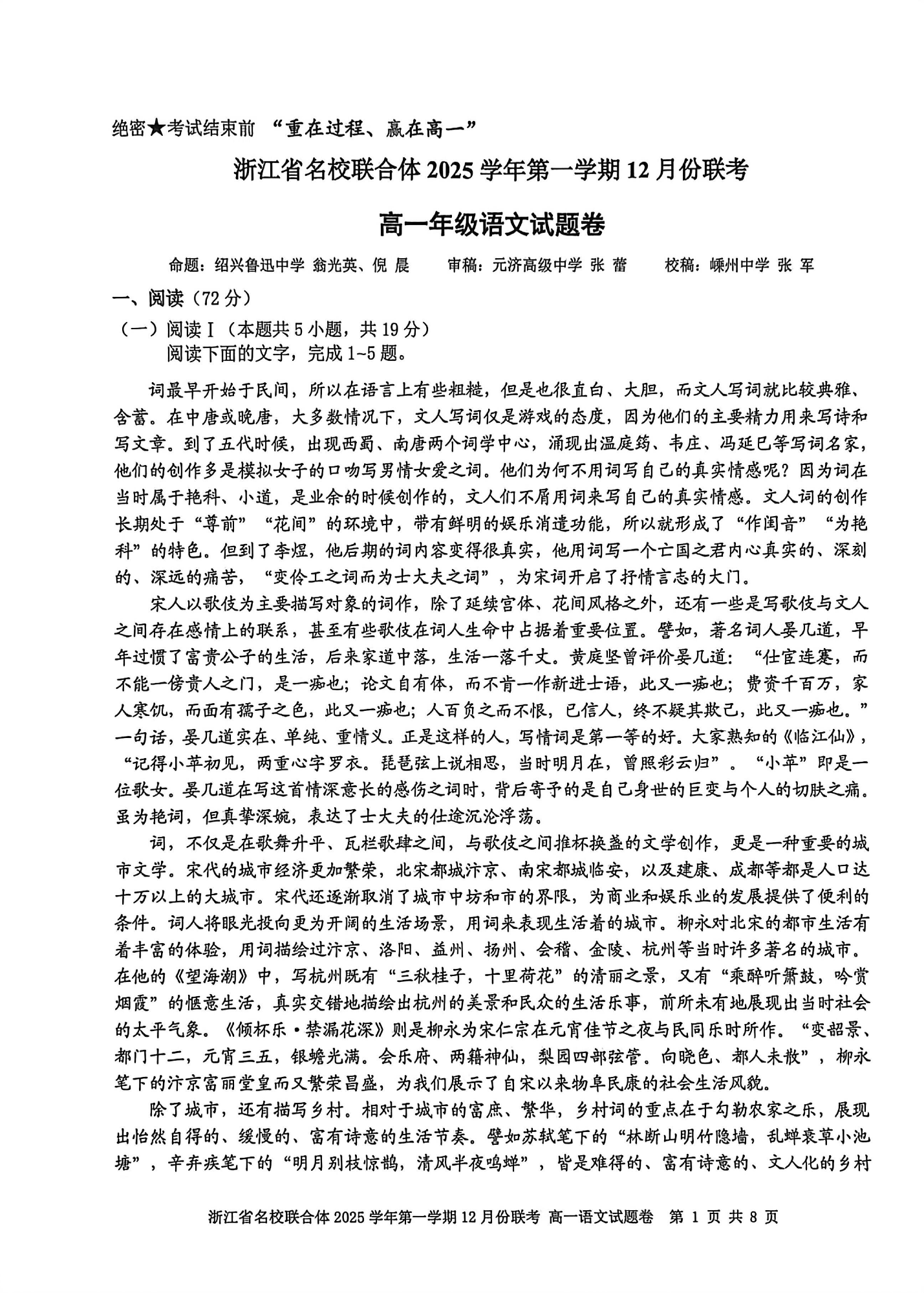 高一语文--浙江省名校联合体2025-2026学年高一上学期12月月考