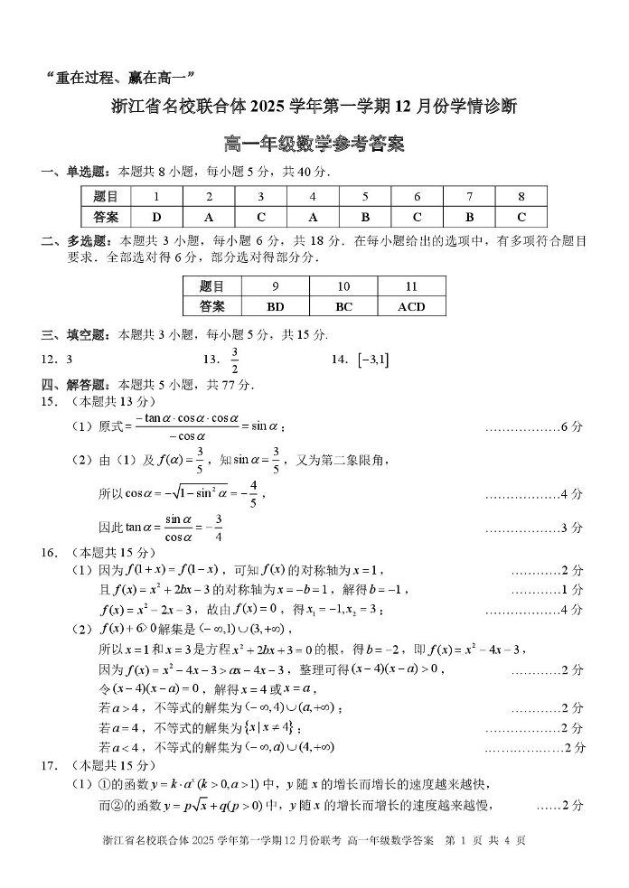 高一数学答案--浙江省名校联合体2025-2026学年高一上学期12月月考