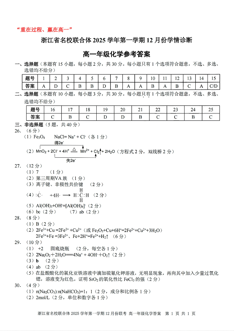 高一化学答案--浙江省名校联合体2025-2026学年高一上学期12月月考