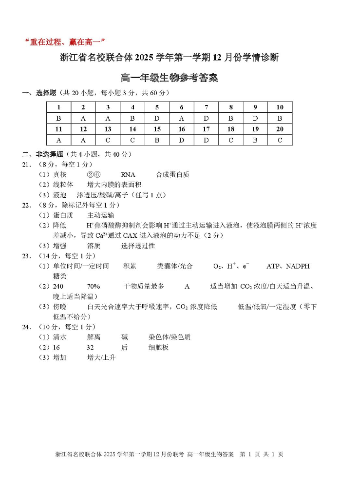 高一生物答案--浙江省名校联合体2025-2026学年高一上学期12月月考