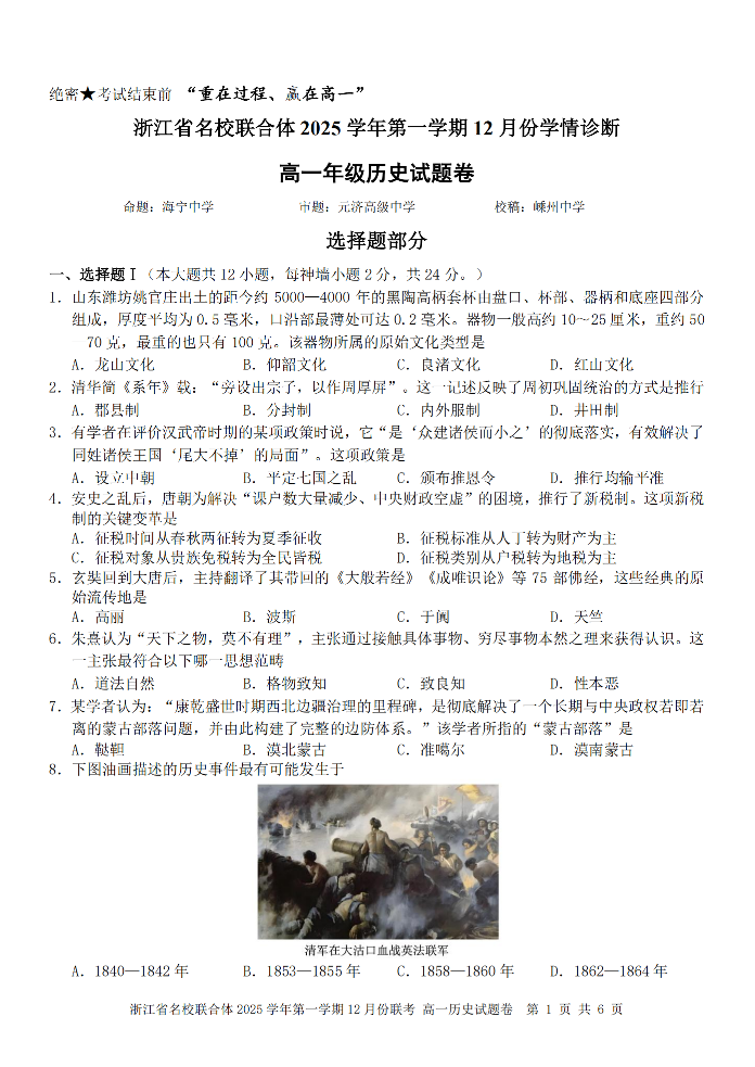 高一历史--浙江省名校联合体2025-2026学年高一上学期12月月考