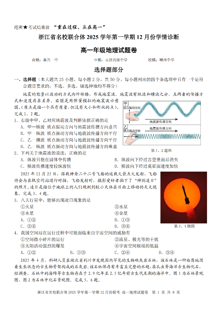 高一地理--浙江省名校联合体2025-2026学年高一上学期12月月考