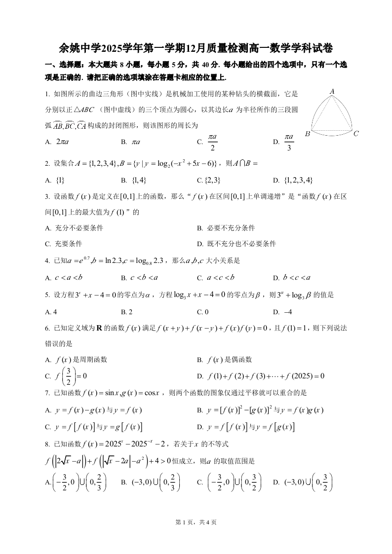高一数学--浙江省余姚中学2025-2026学年高一上学期12月月考