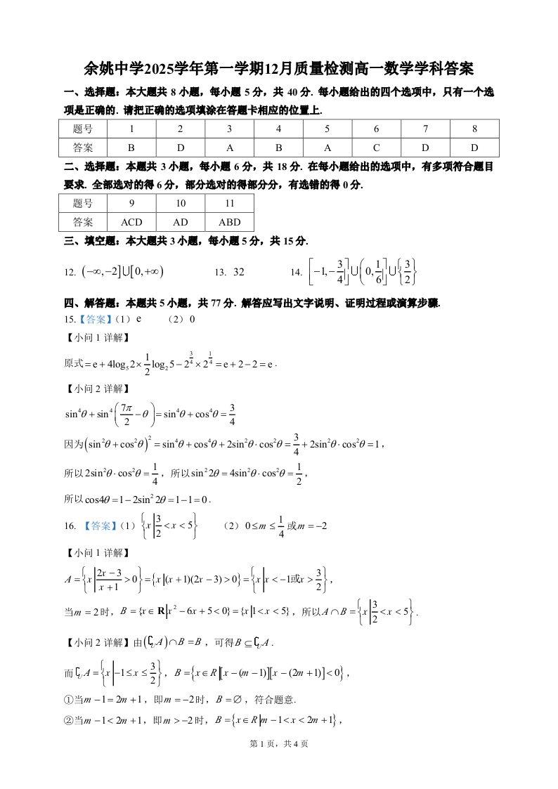 高一数学答案--浙江省余姚中学2025-2026学年高一上学期12月月考
