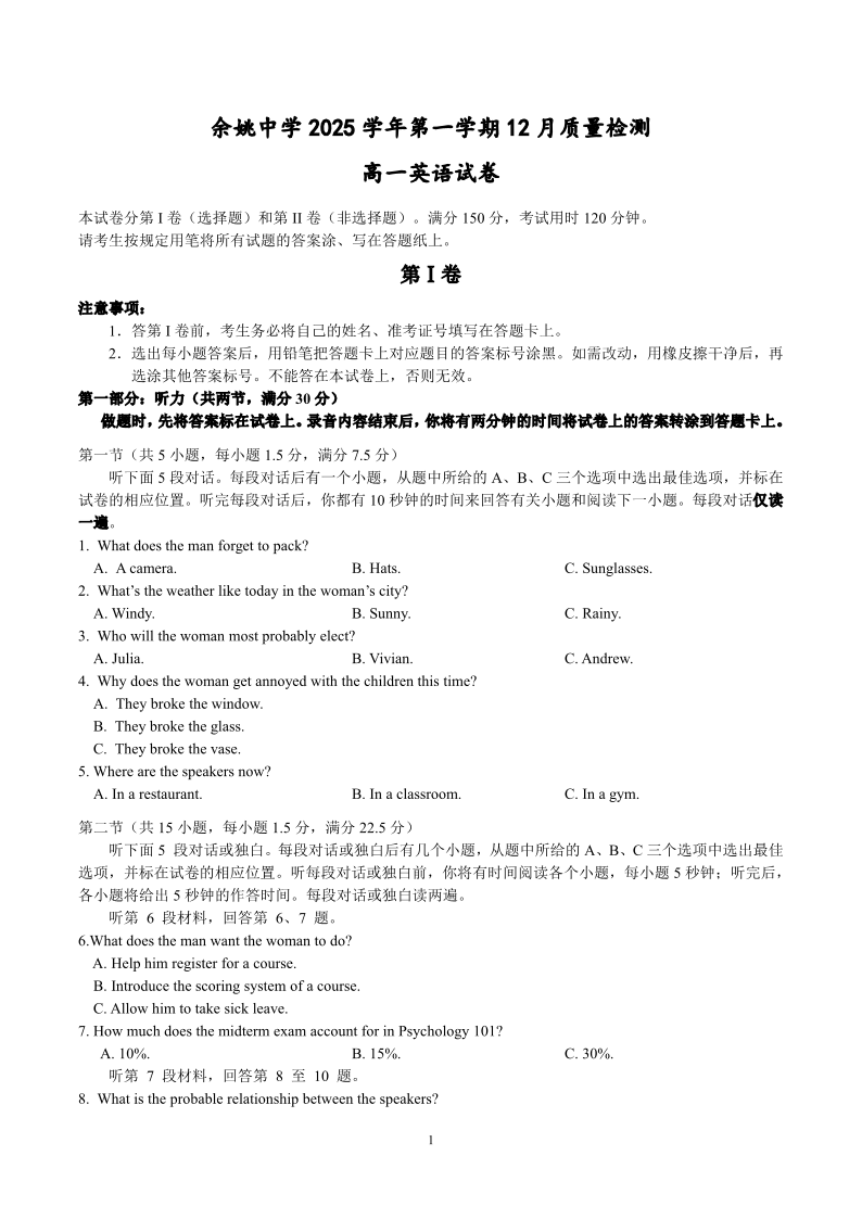 高一英语--浙江省余姚中学2025-2026学年高一上学期12月月考