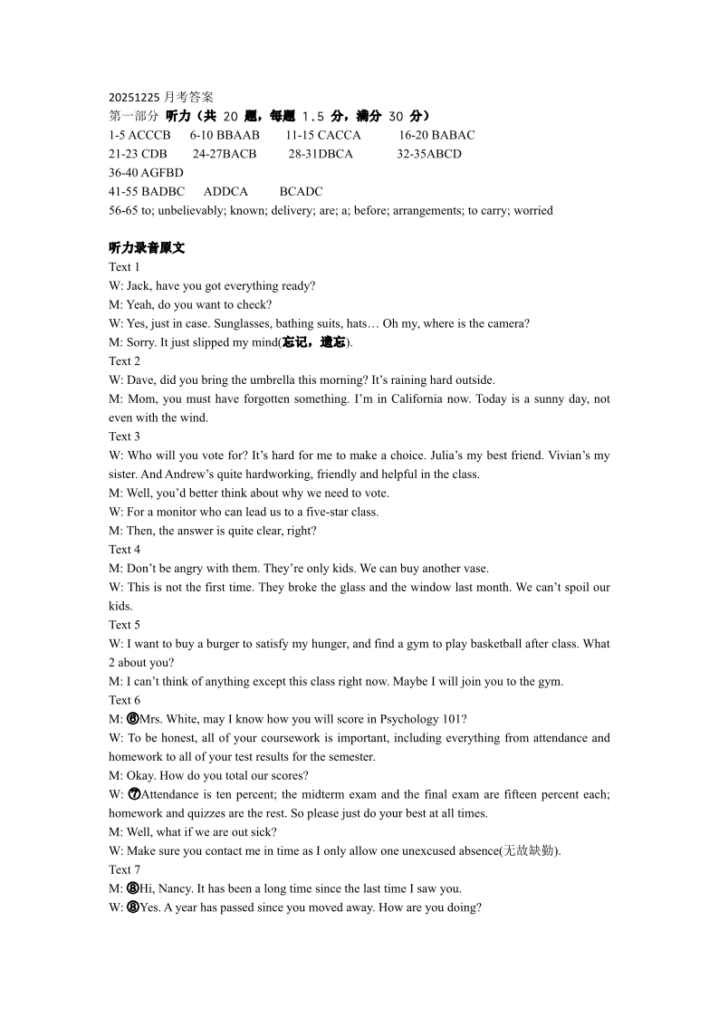 高一英语答案--浙江省余姚中学2025-2026学年高一上学期12月月考