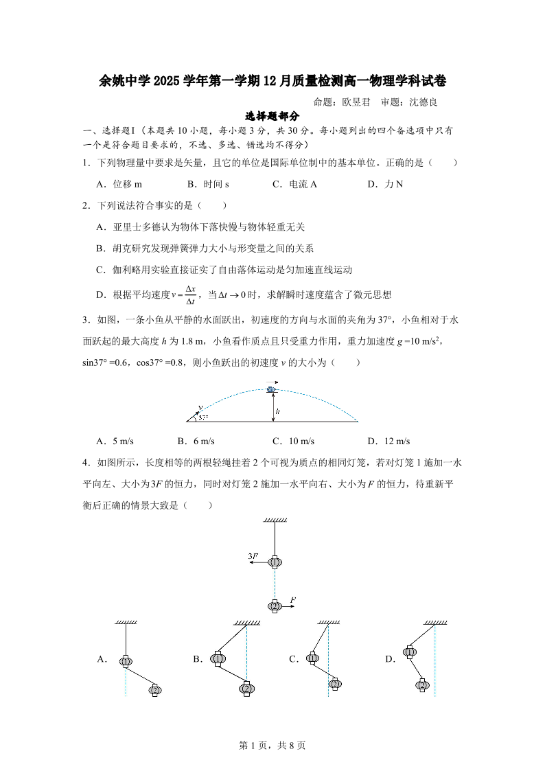 高一物理--浙江省余姚中学2025-2026学年高一上学期12月月考