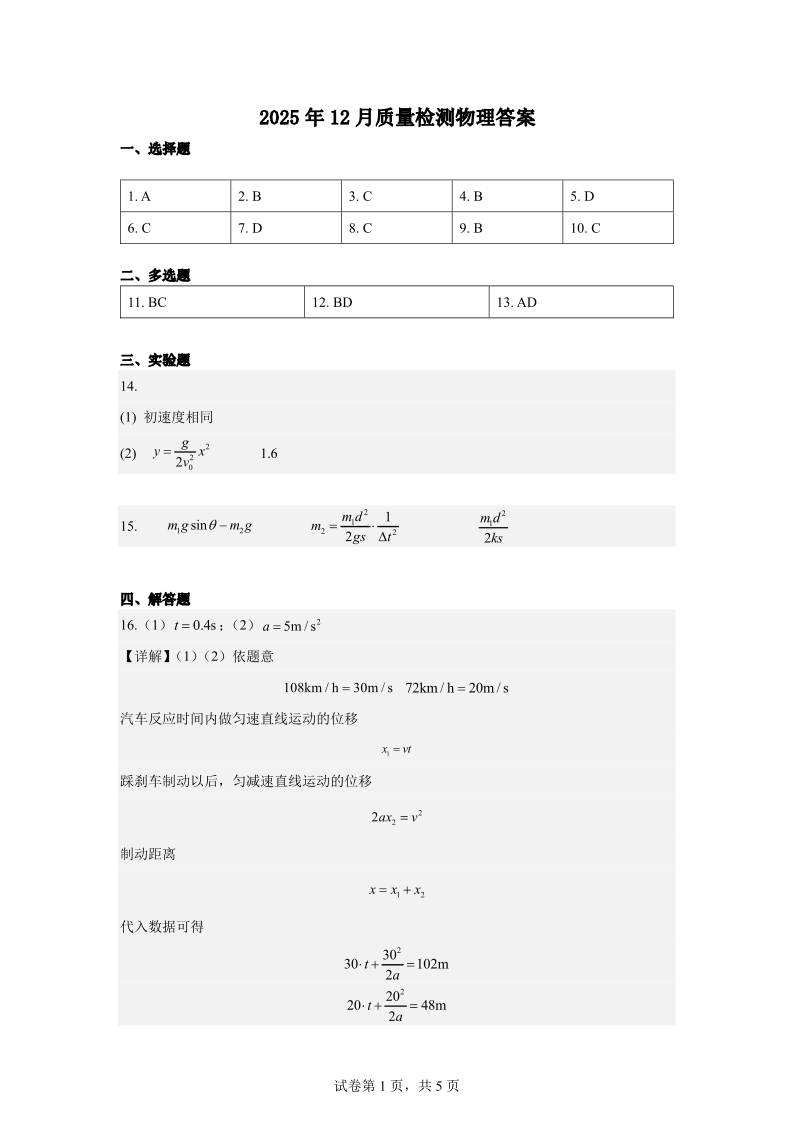 高一物理答案--浙江省余姚中学2025-2026学年高一上学期12月月考