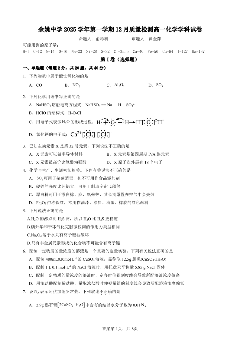 高一化学--浙江省余姚中学2025-2026学年高一上学期12月月考