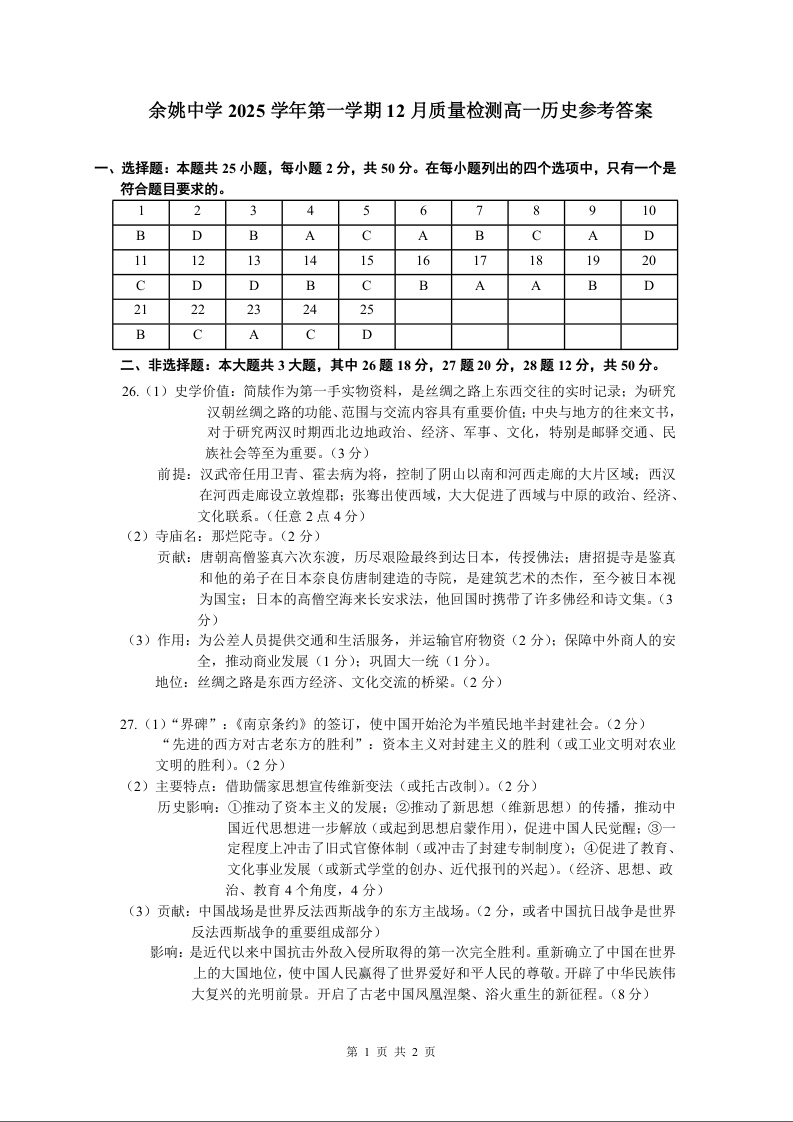 高一历史答案--浙江省余姚中学2025-2026学年高一上学期12月月考