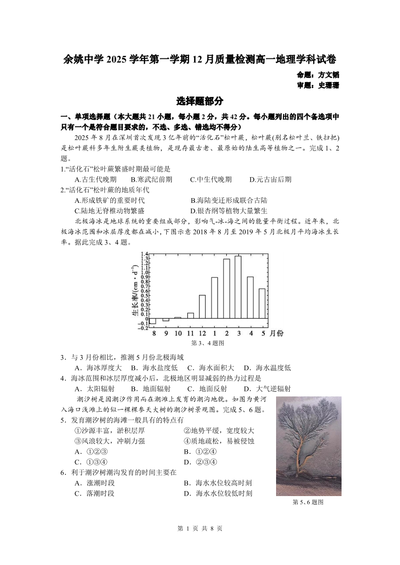 高一地理--浙江省余姚中学2025-2026学年高一上学期12月月考
