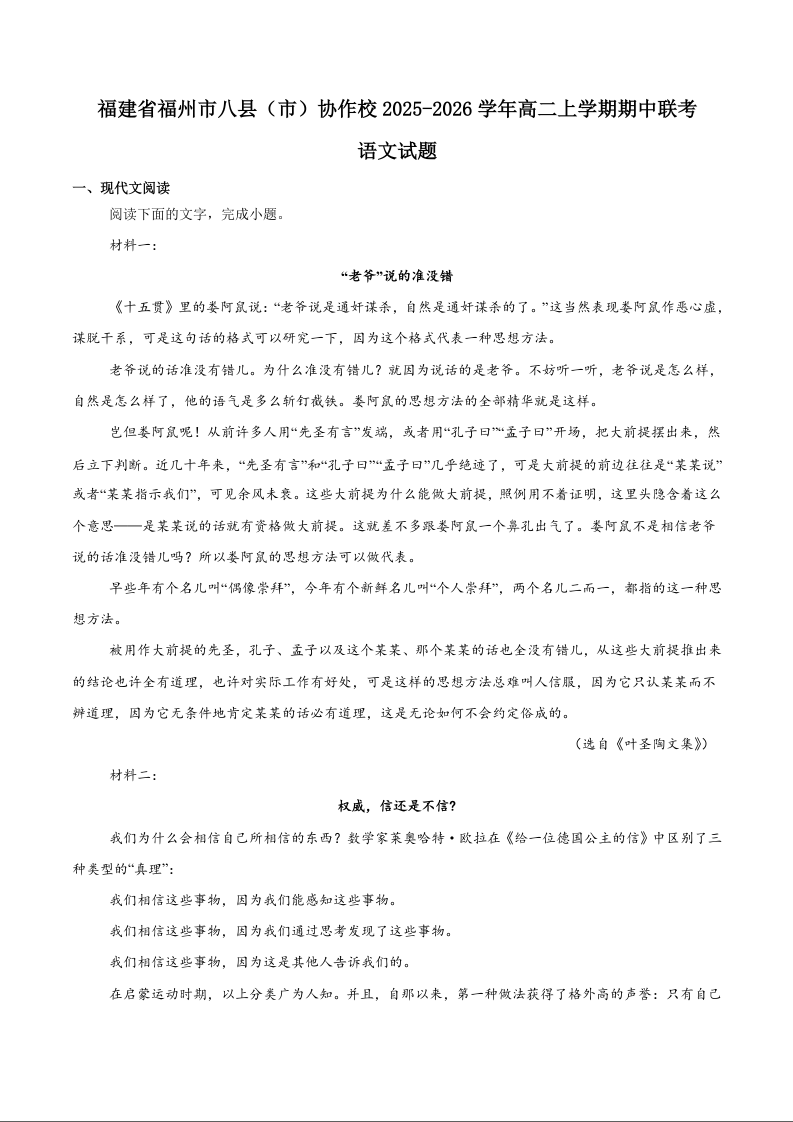 高二语文+答案--福建省福州市八县(市)协作校2025-2026学年高二上学期期中联考