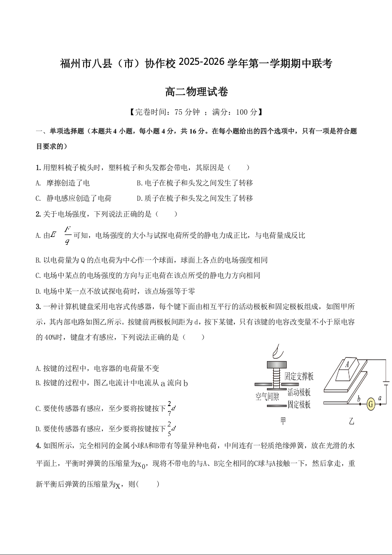 高二物理+答案--福建省福州市八县(市)协作校2025-2026学年高二上学期期中联考