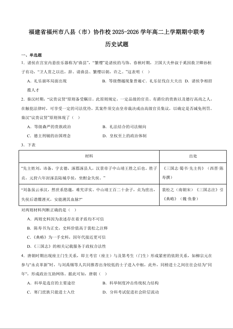 高二历史+答案--福建省福州市八县(市)协作校2025-2026学年高二上学期期中联考