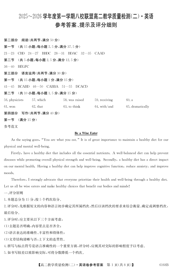 高二英语答案--广东省纵千文化2025~2026学年度第一学期八校联盟高二教学质量检测(二)