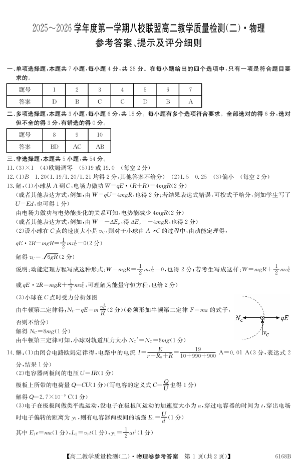 高二物理答案--广东省纵千文化2025~2026学年度第一学期八校联盟高二教学质量检测(二)