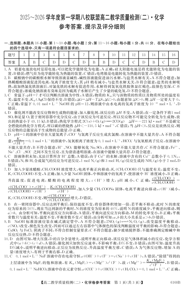 高二化学答案--广东省纵千文化2025~2026学年度第一学期八校联盟高二教学质量检测(二)