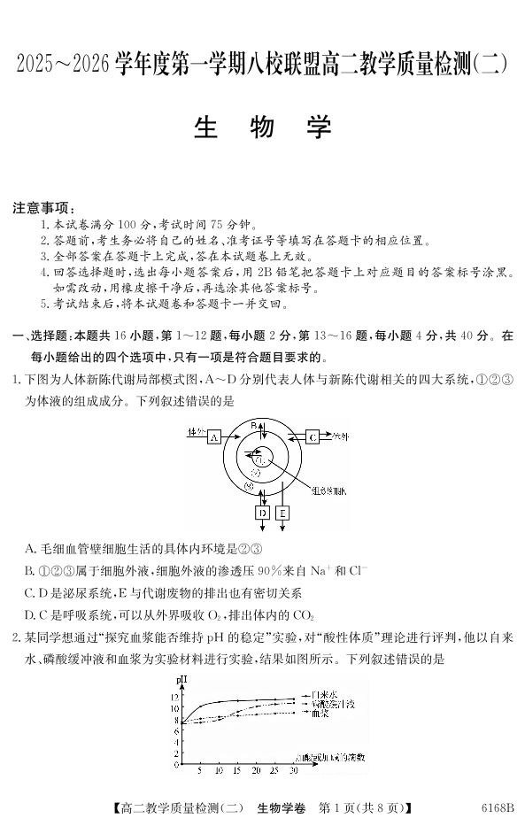 高二生物--广东省纵千文化2025~2026学年度第一学期八校联盟高二教学质量检测(二)
