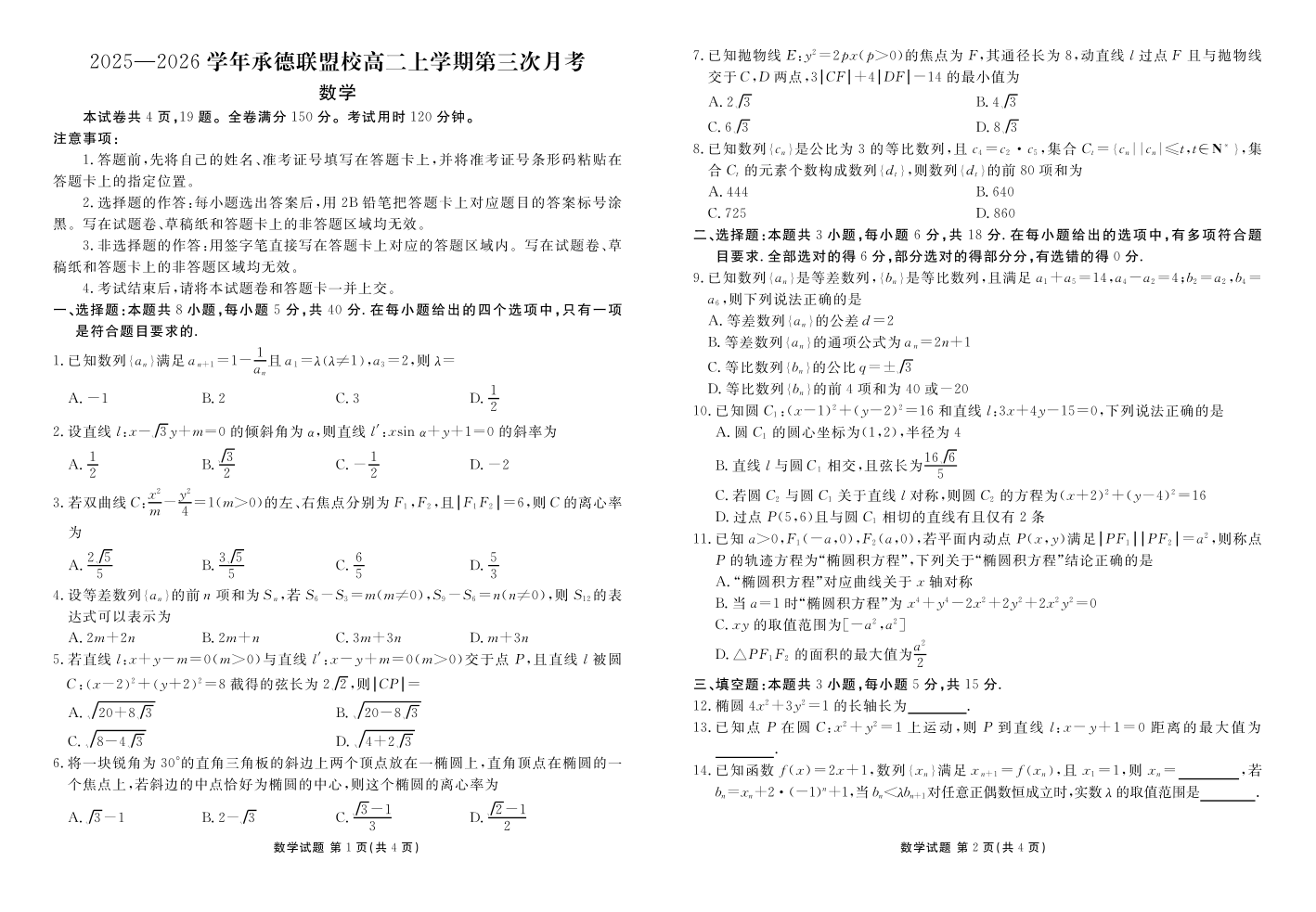 高二数学--河北省衡水金卷2025—2026学年承德联盟校高二上学期第三次月考