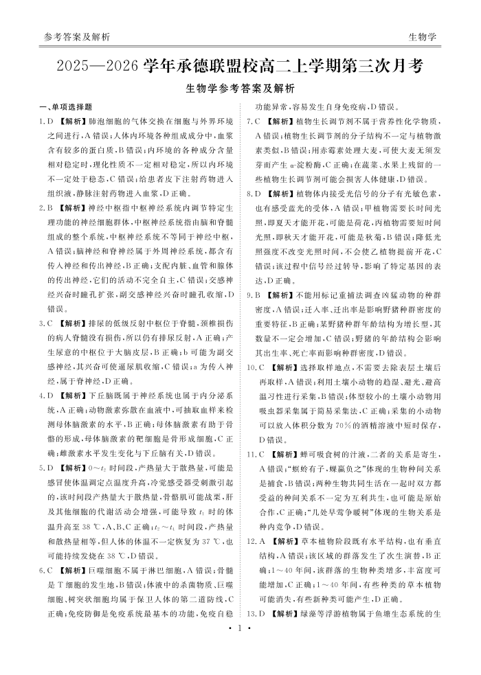 高二生物答案--河北省衡水金卷2025—2026学年承德联盟校高二上学期第三次月考