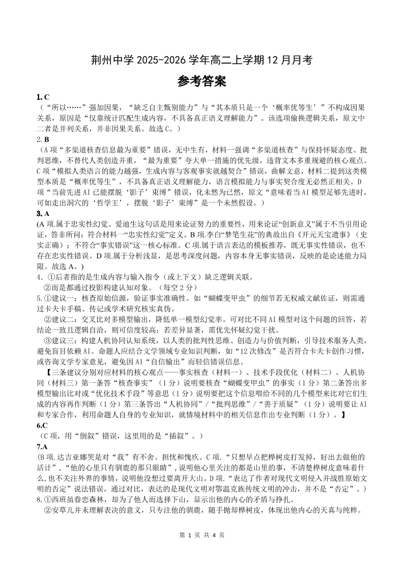 高二语文答案--湖北省荆州市荆州中学2025-2026学年高二上学期12月月考
