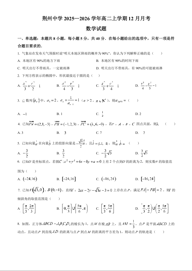 高二数学(原卷版)--湖北省荆州市荆州中学2025-2026学年高二上学期12月月考