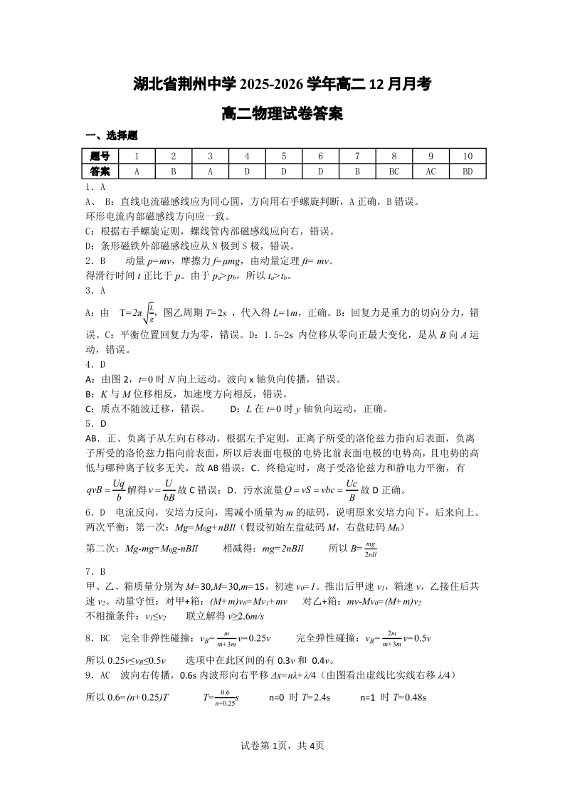 高二物理答案--湖北省荆州市荆州中学2025-2026学年高二上学期12月月考