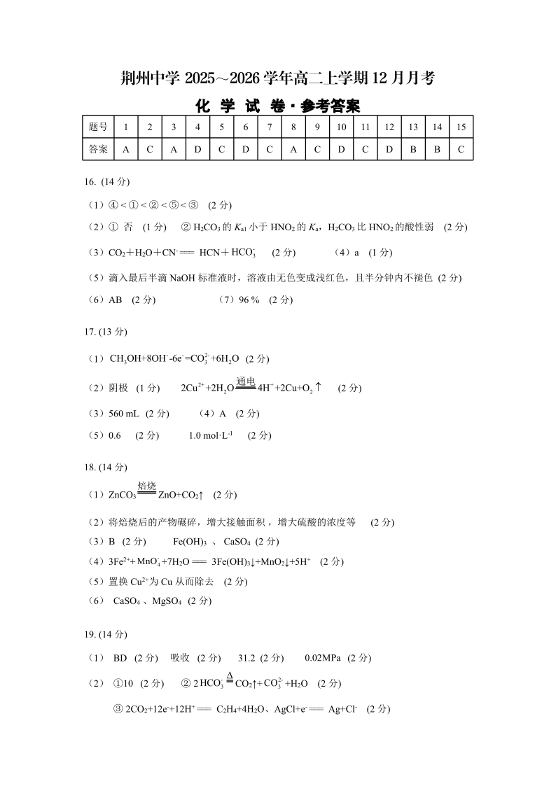 高二化学答案--湖北省荆州市荆州中学2025-2026学年高二上学期12月月考