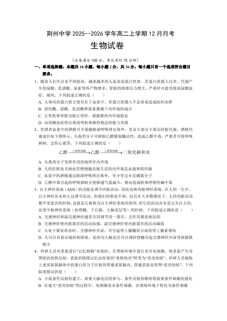 高二生物--湖北省荆州市荆州中学2025-2026学年高二上学期12月月考