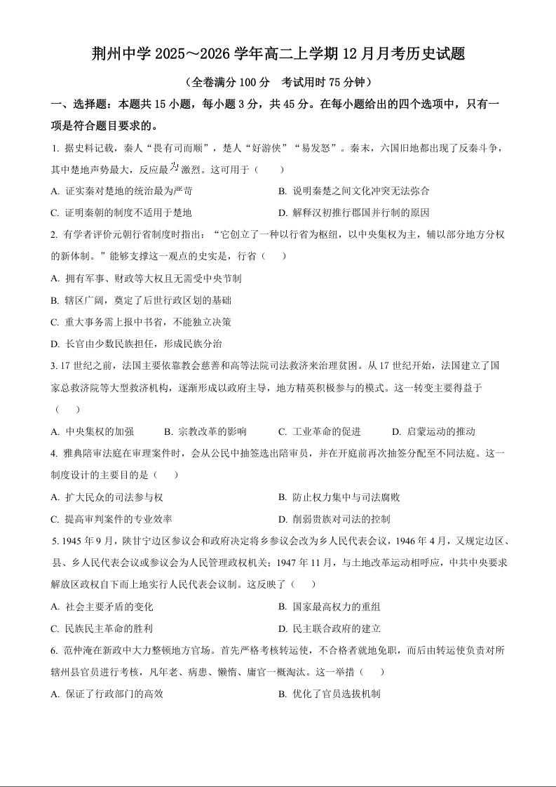 高二历史(原卷版)--湖北省荆州市荆州中学2025-2026学年高二上学期12月月考